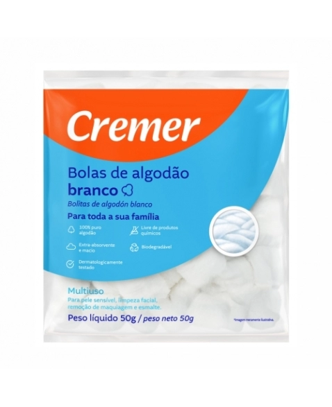 Algodao hidrofilo de alta absorcao para curativos, limpeza e higiene pessoal. Material macio e atossico, ideal para uso diario em cuidados de saude. CREMER.