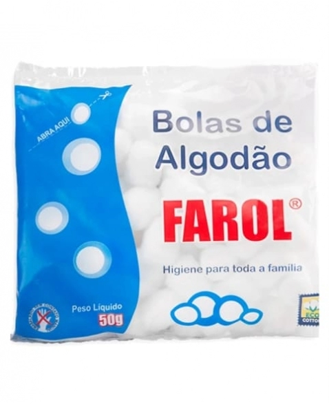 Algodao hidrofilo de alta absorcao para curativos, limpeza e higiene pessoal. Material macio e atossico, ideal para uso diario em cuidados de saude. FAROL.