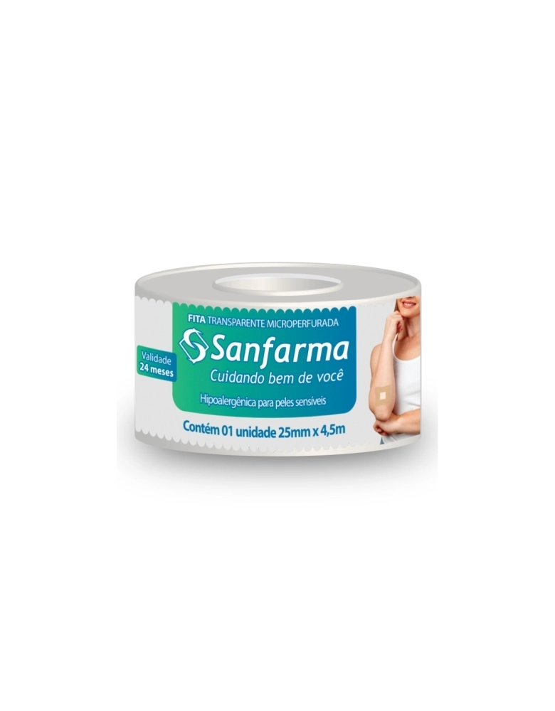 Fita adesiva hipoalergenica para fixacao de curativos e ataduras. Alta aderencia, porem de remocao suave da pele. Indicada para uso clinico e domiciliar. SANFARMA.