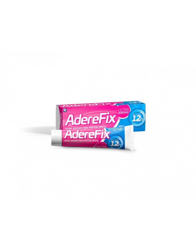 Fixador para protese dental que garante seguranca, conforto e confianca durante o dia. Formula resistente a alimentos e liquidos, de facil remocao. ADEREFIX.
