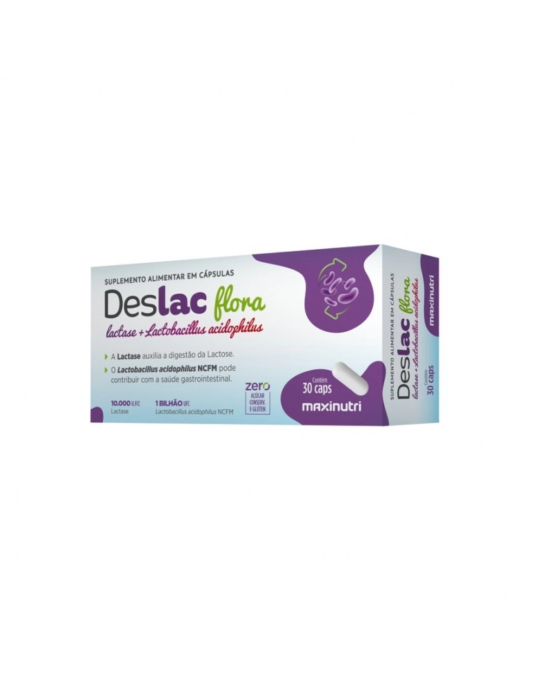 PRODUTOS>NUTRACÊUTICOS>MAXINUTRI>DESLAC FLORA (LACTASE + LACTOBACILLUS ACIDOPHILUS) - CX COM 30 CÁPSULAS MAXINUTRI