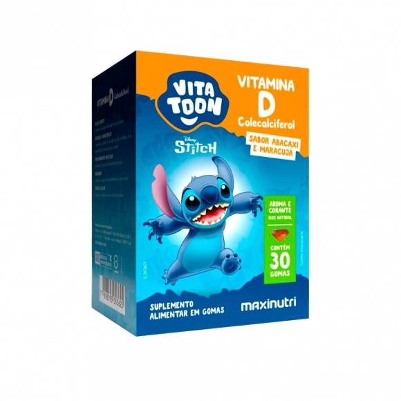 PRODUTOS>NUTRACÊUTICOS>MAXINUTRI>VITATOON STITCH VITAMINA D SABOR ABACAXI COM MARACUJA COM 30 GOMAS MAXINUTRI