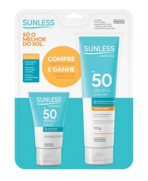 PRODUTOS>COSMÉTICOS>SUNLESS>KIT PROTETOR SOLAR FPS 50 120G + FACIAL FPS 50 GRATIS SUNLESS FARMAX