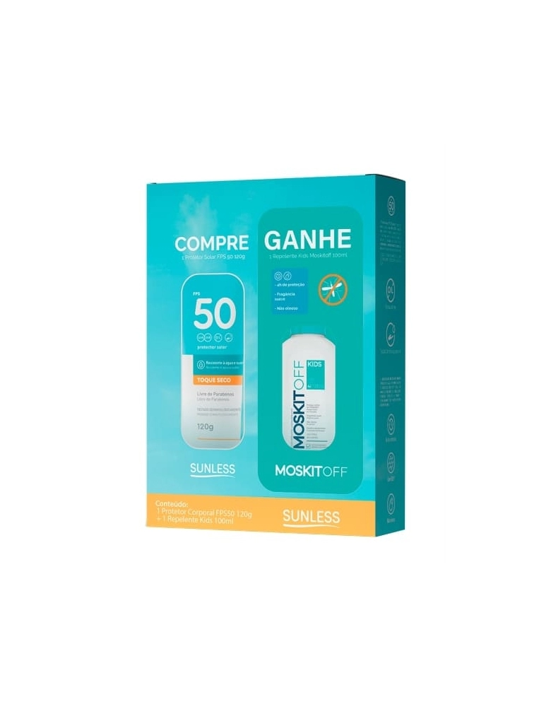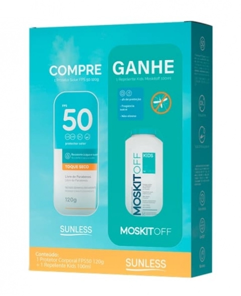 PRODUTOS>COSMÉTICOS>SUNLESS>KIT PROTETOR SOLAR FPS 50 120G + REPELENTE KIDS 100ML SUNLESS FARMAX