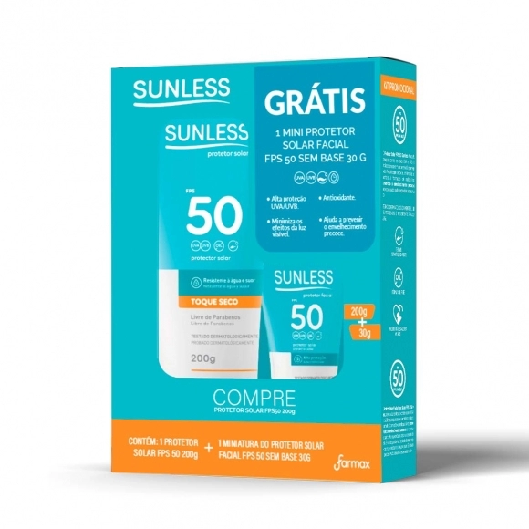 PRODUTOS>COSMÉTICOS>SUNLESS>KIT PROTETOR SOLAR FPS 50 200G + PROTETOR SOLAR FPS 50 MINIATURA SUNLESS FARMAX