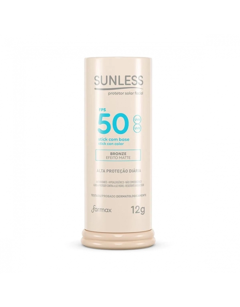 PRODUTOS>COSMÉTICOS>SUNLESS>PROTETOR SOLAR FACIAL STICK FPS 50 COM BASE BRONZE SUNLESS 12G FARMAX
